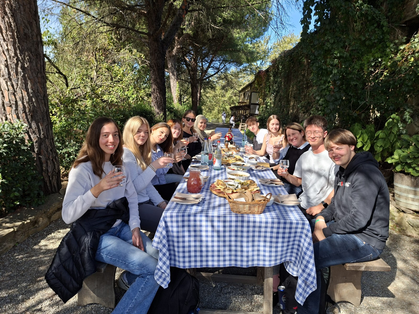 Auf dem Titelbild sieht man das Seminarfach Erdkunde 13 bei seiner Exkursion zur Fattoria La Vialla nördlich von Arezzo. Die Kursfahrt ging, zusammen mit dem Seminarfach Kunst, nach Florenz.