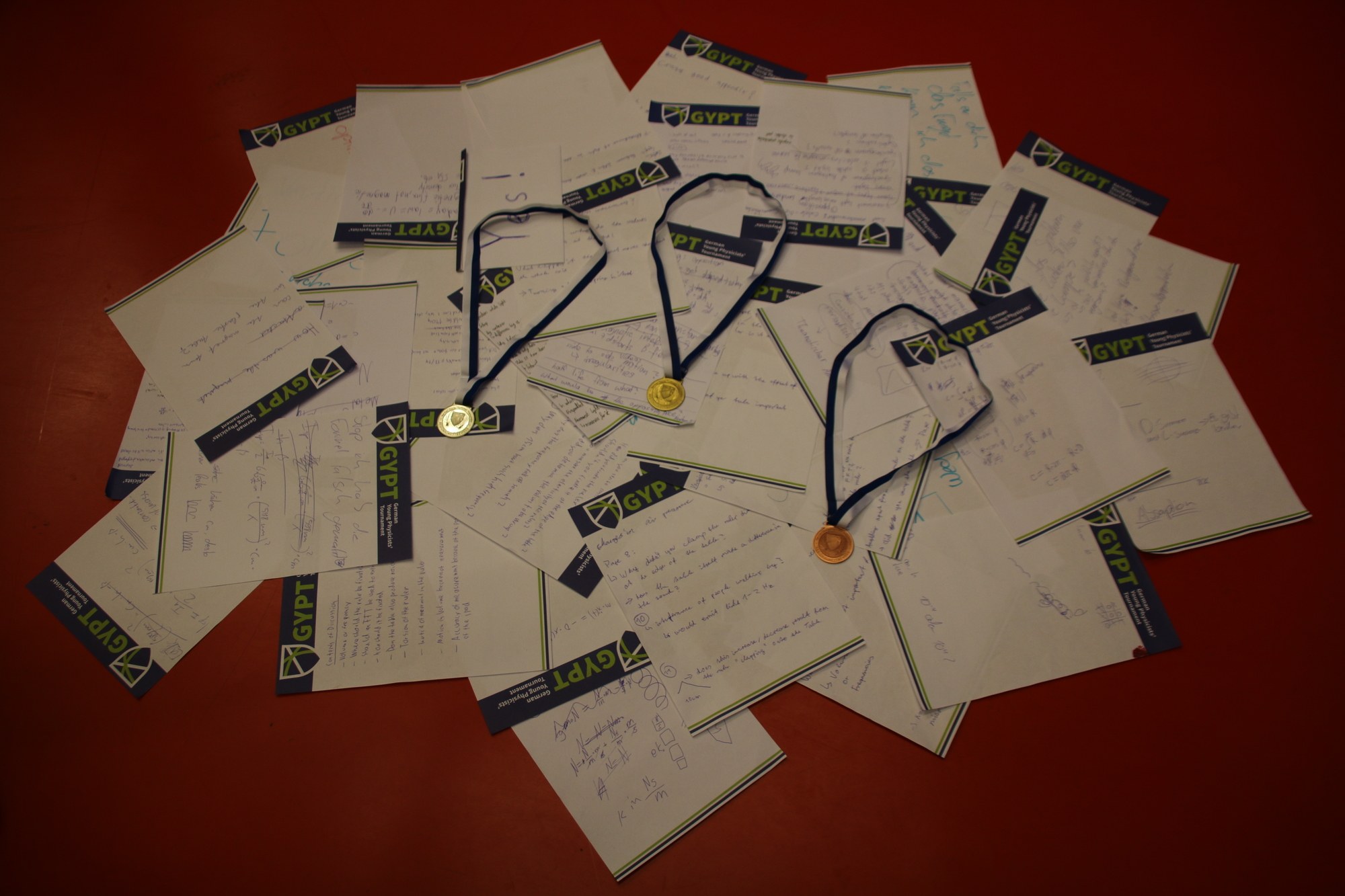 Abb. 4: Notizen der Teams während der „Physics-Fights“ zusammen mit den GYPT-Medaillen